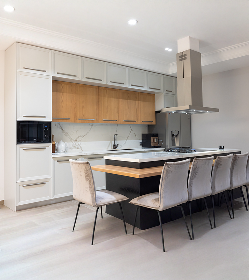 Kuzhina të personalizuara, të dizajnuara sipas materialeve, përmasave dhe ideve tuaja të dizajnit, me integrim të përsosur në hapësirë.